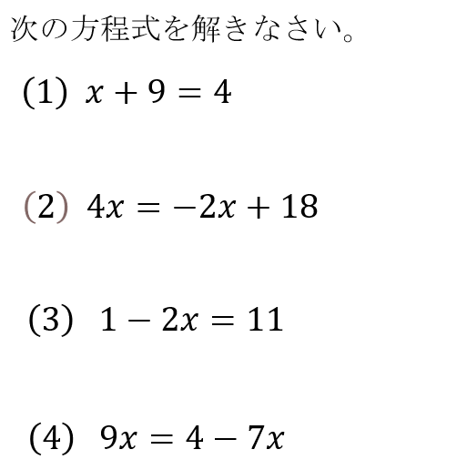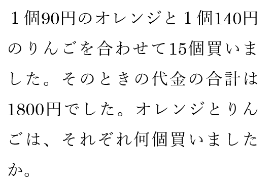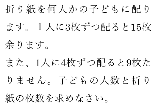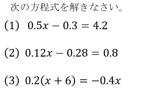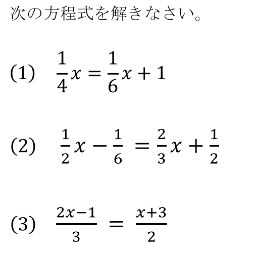2025年5月17日 / 最終更新日時 : 2025年5月24日 takumi 中1数学 【3章 1次方程式】 目次1 方程式とその解2 等式の性質を使った方程式の解き方3 移項 ー その14 移項 ー その25 かっこのある1次方程式6 小数を含む1次方程式7 分数を含む1次方程式8 いろいろな方程式9 比例式10 移項の仕方の工夫11 方程式の解に関する問題12 代金と個数に関する問題ーその113 代金と個数に関する問題ーその214 分配に関する問題15 過不足に関する問題16 年齢に関する問題17 比に関する問題18 追いかける問題19 池をまわる問題20 食塩水の問題21 規則性に関する問題 方程式とその解 等式の性質を使った方程式の解き方 移項 ー その1 移項 ー その2 かっこのある1次方程式 小数を含む1次方程式 分数を含む1次方程式 いろいろな方程式 比例式 移項の仕方の工夫 方程式の解に関する問題 代金と個数に関する問題ーその1 代金と個数に関する問題ーその2 分配に関する問題 過不足に関する問題 年齢に関する問題 比に関する問題 追いかける問題 池をまわる問題 食塩水の問題 規則性に関する問題