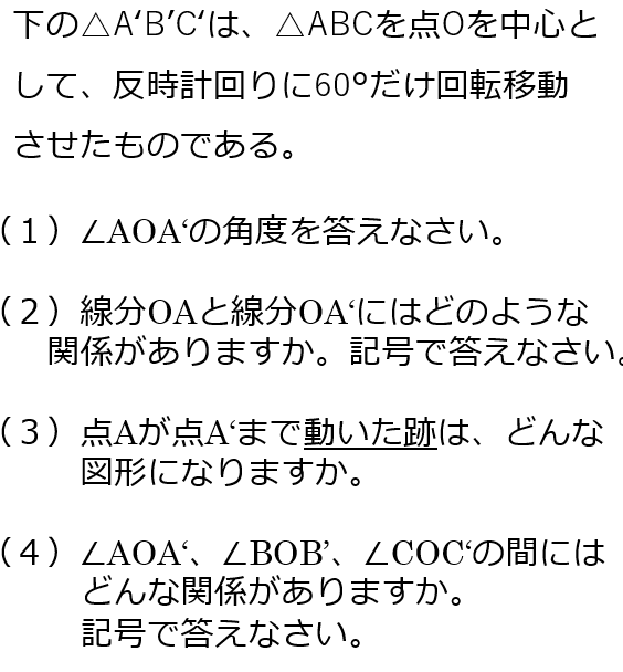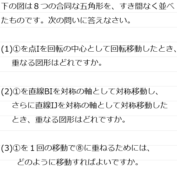 2025年12月24日 / 最終更新日時 : 2026年1月15日 takumi 中1数学 【5章 平面図形】 目次1 平面図形で一番はじめに勉強すること2 平行移動ーその13 平行移動ーその24 回転移動ーその15 回転移動ーその26 対称移動ーその17 対称移動ーその28 図形の移動ーその19 図形の移動ーその210 11 12 13 14 15 16 17 18 19 20 21 22 23 24 平面図形で一番はじめに勉強すること 平行移動ーその1 平行移動ーその2 回転移動ーその1 回転移動ーその2 対称移動ーその1 対称移動ーその2 図形の移動ーその1 図形の移動ーその2